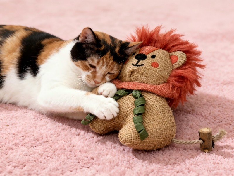 Burlap Lion Pet Toy with Wooden Tail - Interactive Textured Chew Toy for Cats & Dogs
